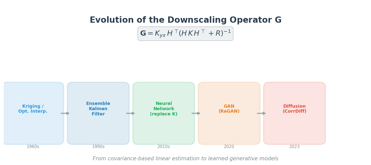 A walkthrough of how the classical covariance-based estimation operator evolves into modern generative downscaling.